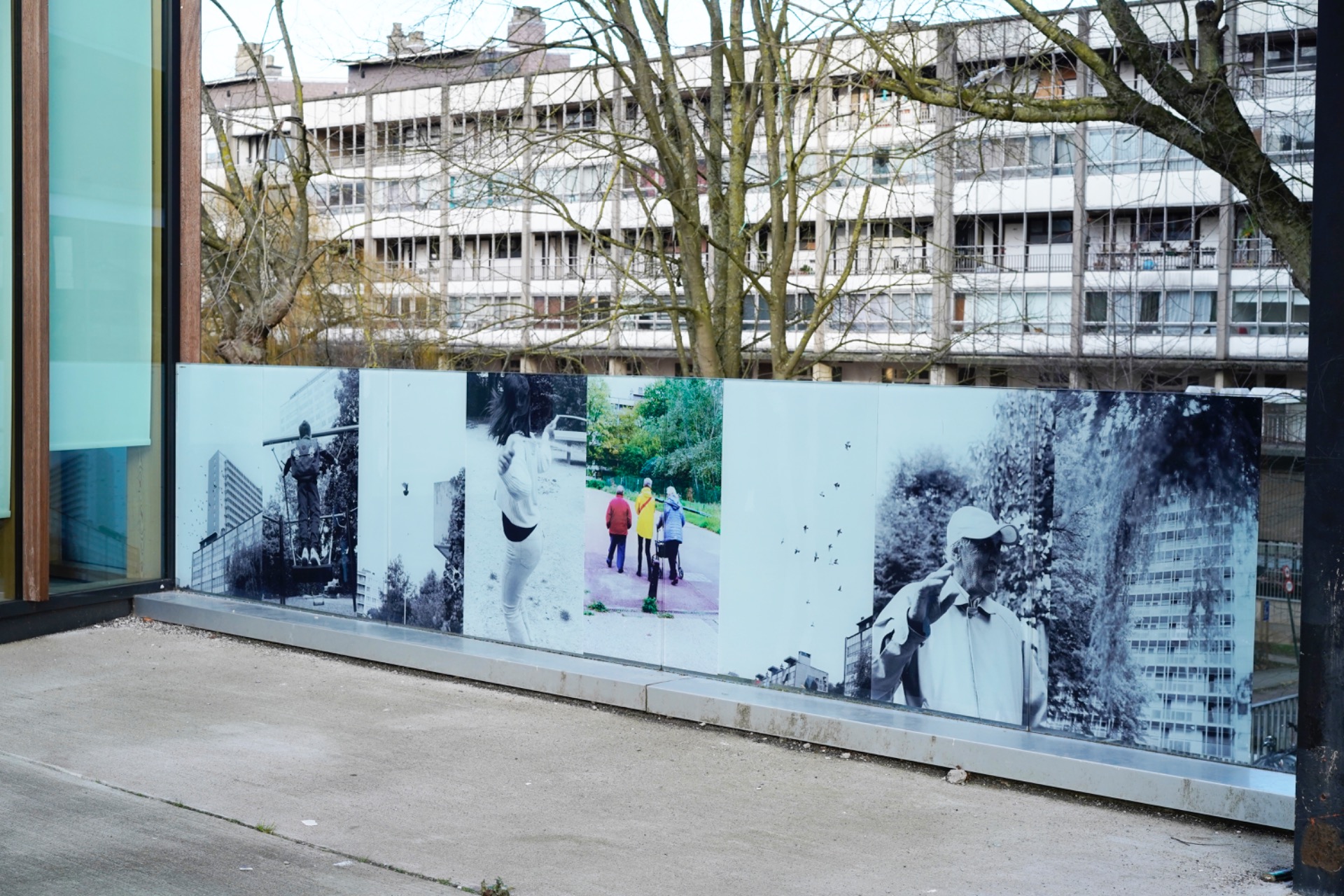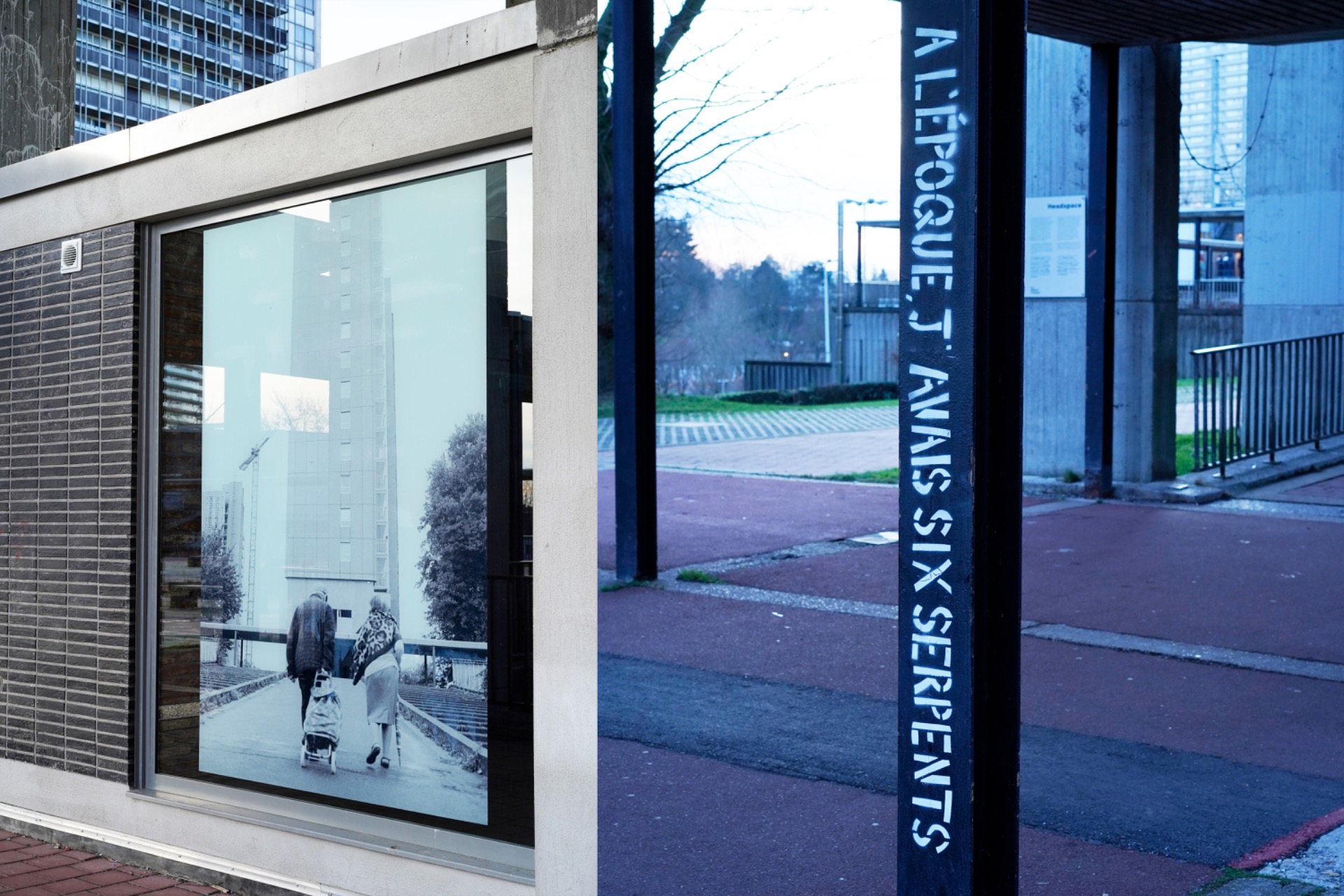 Poetic notes from the chats with the residents indicate a walking path anchored with graffiti on the ground through the site, leading to large-format prints on the windows at various locations in an open air exhibition on display from January to August 2026.